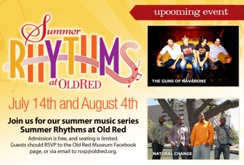 3 AugThere’s another FREE summer concert series you may or may not know about that takes place at Old Red Museum. On Thursday, August 4th the jazz band Natural Change will be playing from 6 to 8pm. Natural Change is a Dallas band that plays smooth jazz and R&B. The first time I heard them they were playing at Brooklyn’s one Saturday night. The four talented musicians will be providing free Summer Rhythms at Old Red Thursday evening. Not only will light hors d’oeuvres be provided but a cash bar will also be available! Keep in mind that this is a free event and Space is limited so RSVP by e-mailing RSVP@OldRed.org or at the Old Red Facebook page. This is the last concert of the series so be sure to RSVP and get there early! Summer Rhythms at Old Red is sponsored by Beyond the Box Catering and Platinum Security.